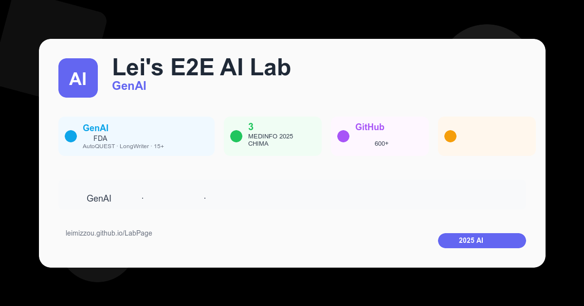 Lei's E2E AI Lab 专注于构建实际可用的GenAI驱动端到端系统。通过AutoQUEST智能评估框架、OpenFDA2PG数据处理工具等15+个开源项目,我们已在FDA医疗数据处理、实验自动化评估、分布式向量计算等领域取得突破性进展。